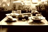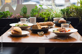 Full table of delicious and different dishes in cafe with cup of coffee in white dinnerware.