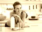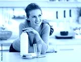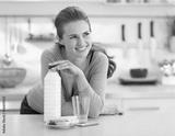 Thoughtful young woman with crisp bread and milk in kitchen