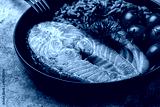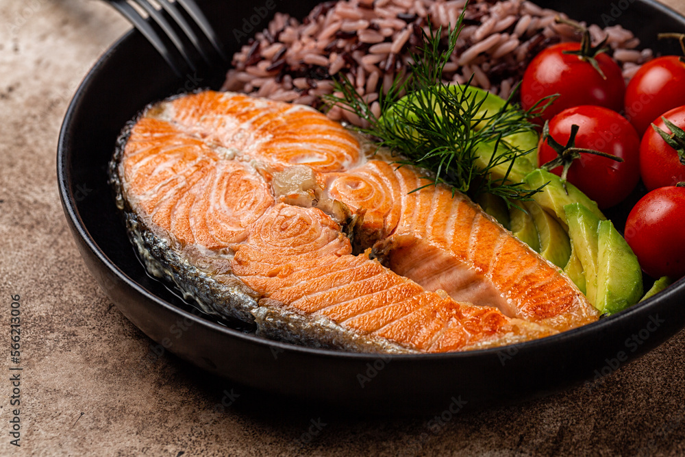 Close-up of dark plate with baked salmon, dill, mix of black and white rice, vegetables, avocado, tomato. Brown background.