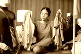 Uncertain young asian woman in casual clothes sitting on comfortable couch trying to decide between cloth against others in living room at home,tired exhausted girl makeing decision for her cloth