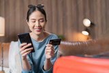 Asian traveller Tourist woman casual cloth in lobby hotel room making credit card reservation for flight ticket while she is unpacking suitcase with pleasure and cheerful
