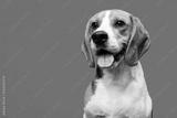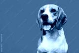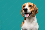 Portrait of a happy beagle dog smiling looking at the camera on a teal blue background