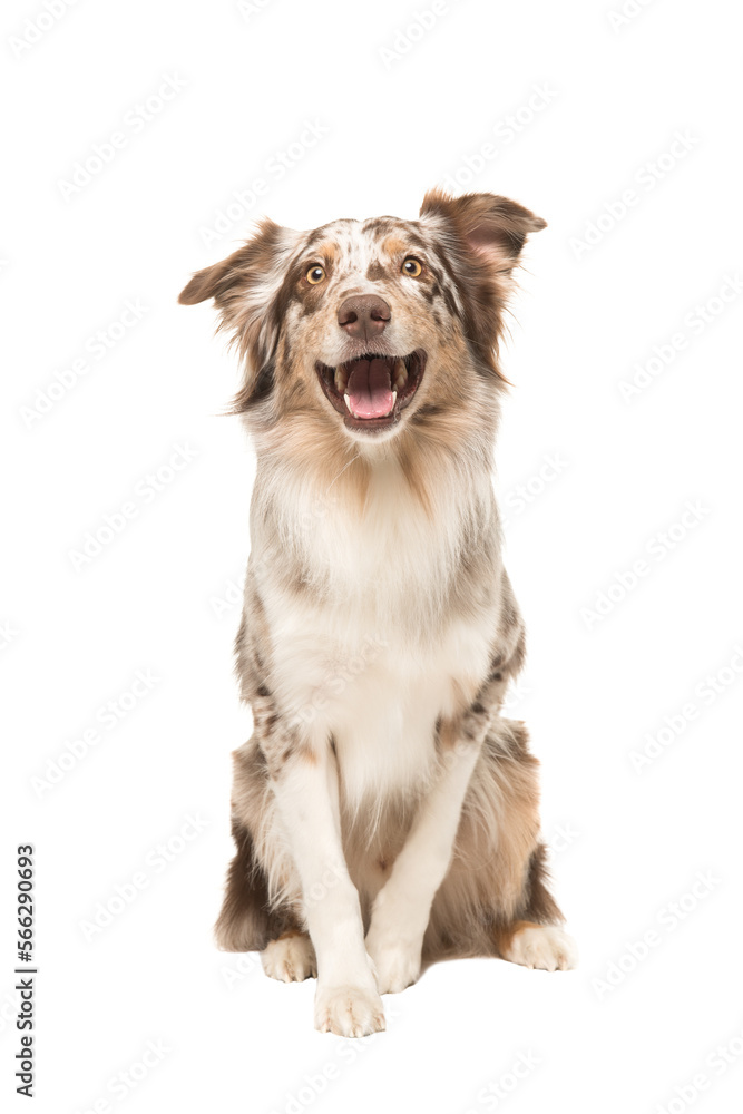 Cute sitting smiling australian shepherd facing the camera with its mouth open