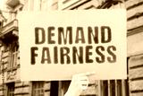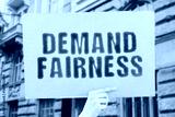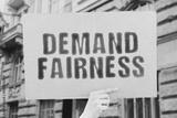 The phrase " Demand Fairness " is on a banner in men's hands with blurred background. Faith. Trust. Partnership. Belief. Confidence. Security. Friendship. Care. Politic. Politics. Government. Power