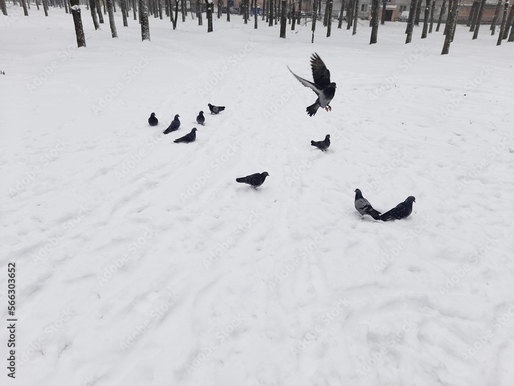 Winter park. A flock of pigeons on a lawn covered with snow.