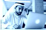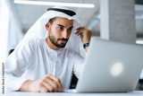 handsome man with dish dasha working in his business office of Dubai. Portraits of a successful businessman in traditional emirates white dress.