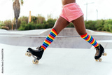 Beautiful woman skating with roller skates and having fun. Professional skater and dancer training in the morning wearing colored and fashionable clothes.