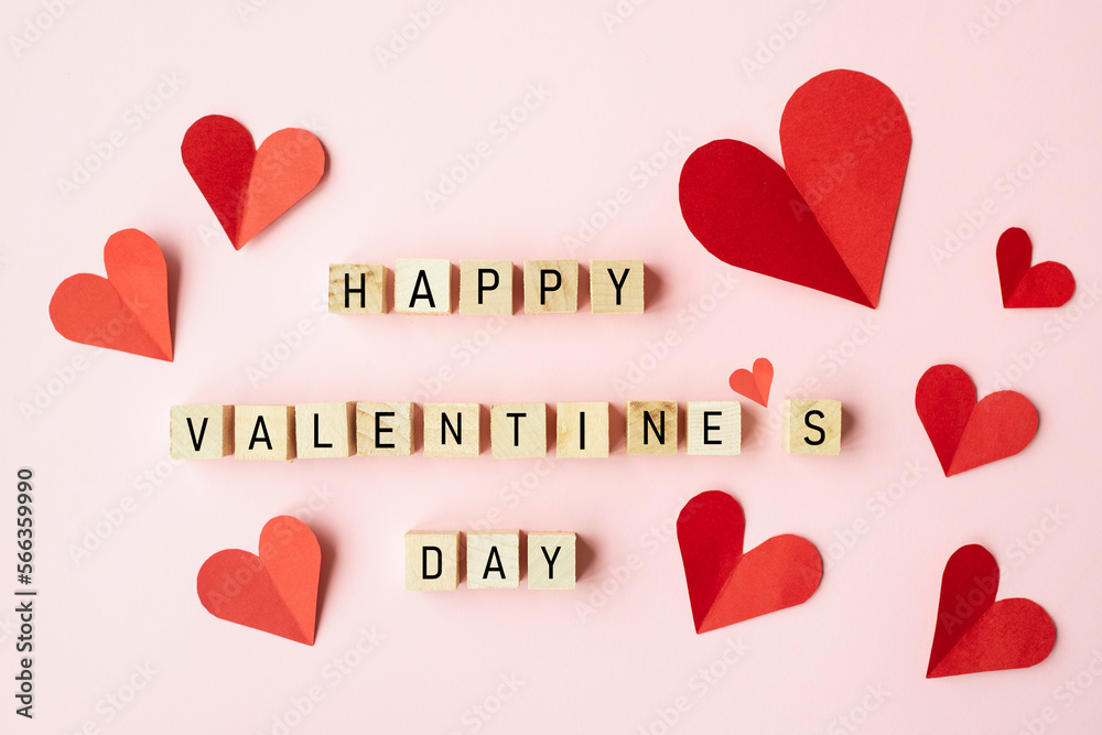 Banner. Word "Happy Valentine's Day". Love in wooden blocks. Love theme. Wooden letter blocks. Loving, positive emotions. Wooden cubes with the word. It's a special relationship.