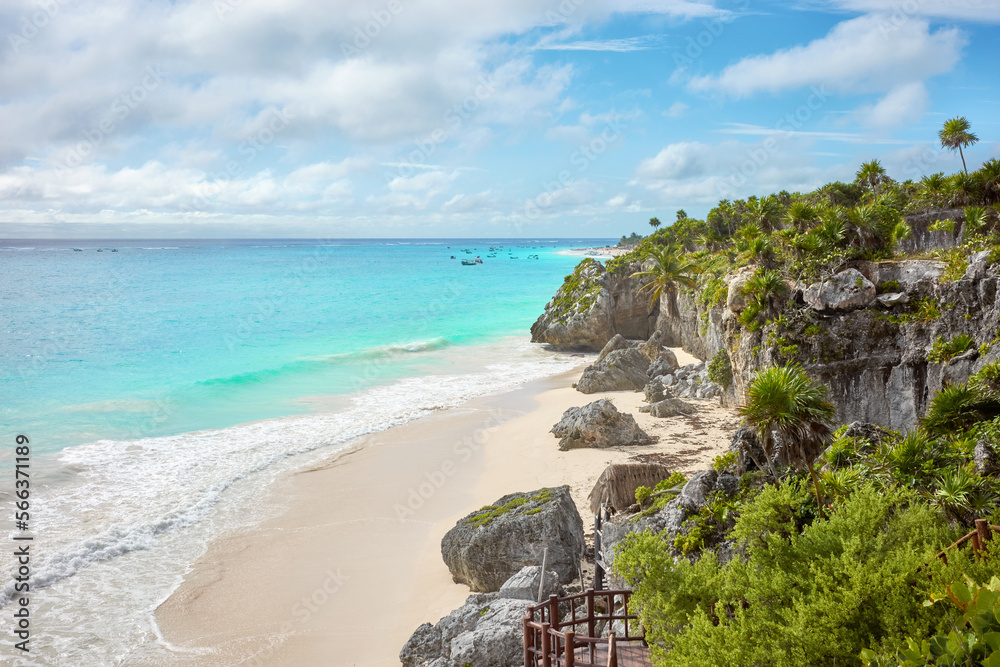 Rocky cliff at the tropical beach of Tulum, Yucatan Peninsula, Mexico.