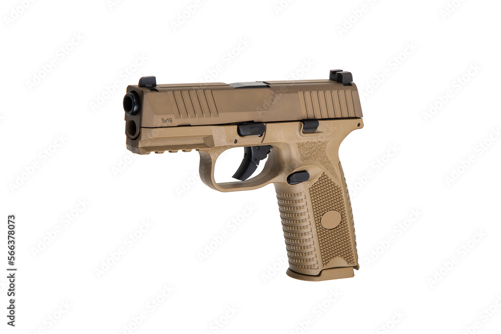 Modern semi-automatic pistol isolate on a white back. Armament for the army and police. Short-barreled coyote-colored weapon.