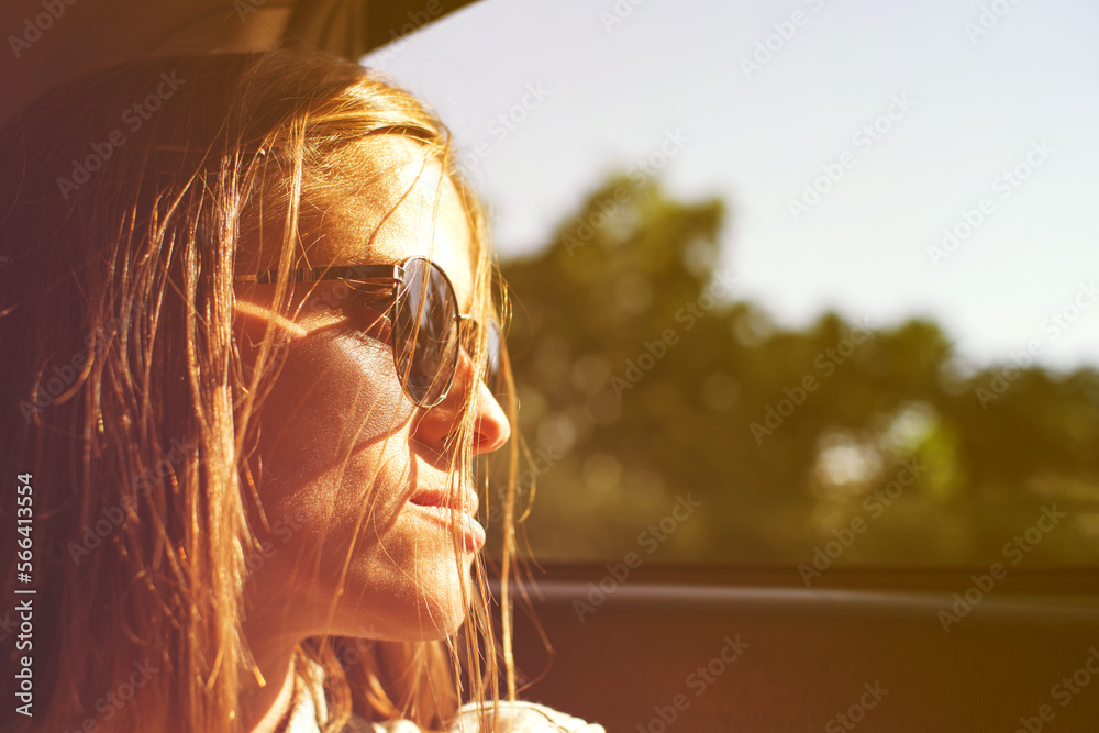 Portrait of a girl in sunglasses looking out of a car window on a sunny day, soft selective focus