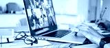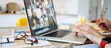 Man sitting at home and working remote using laptop at the kitchen. Video call conference on the screen