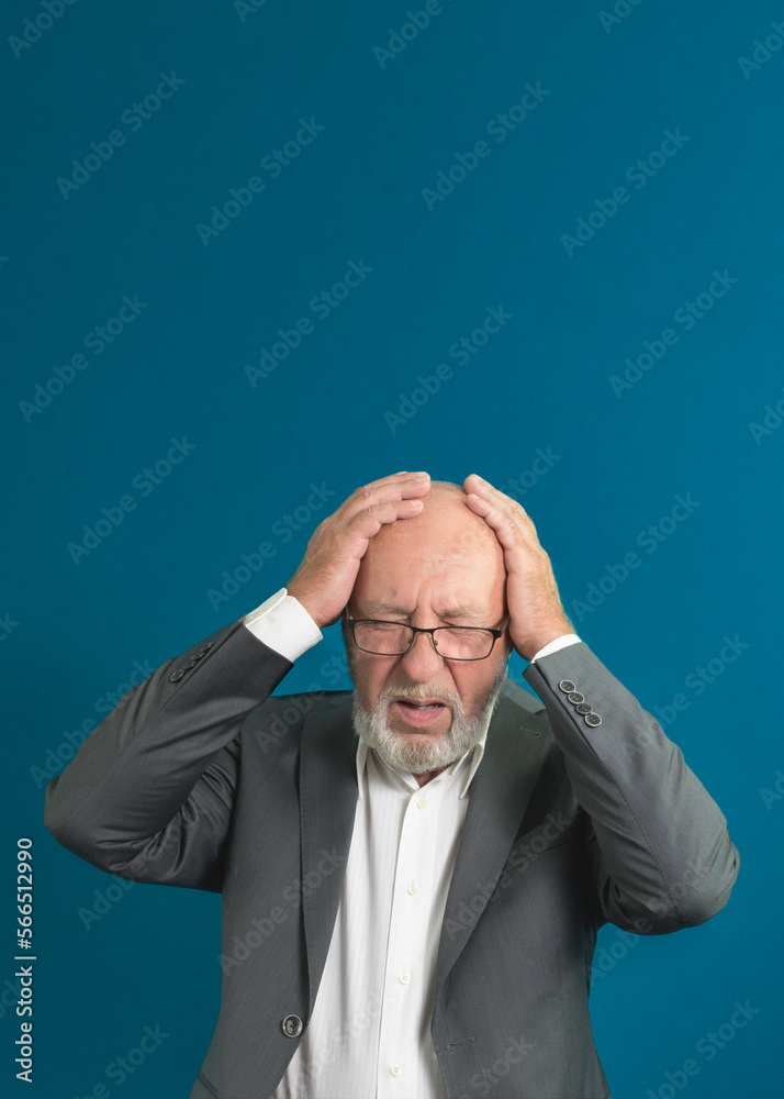 Senior man has a headache. hands on forehead - Need for medical and healthcare help. blue background