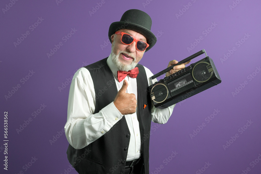 Great 80s. An elderly man in an old classic suit with a cassette recorder on a purple background.