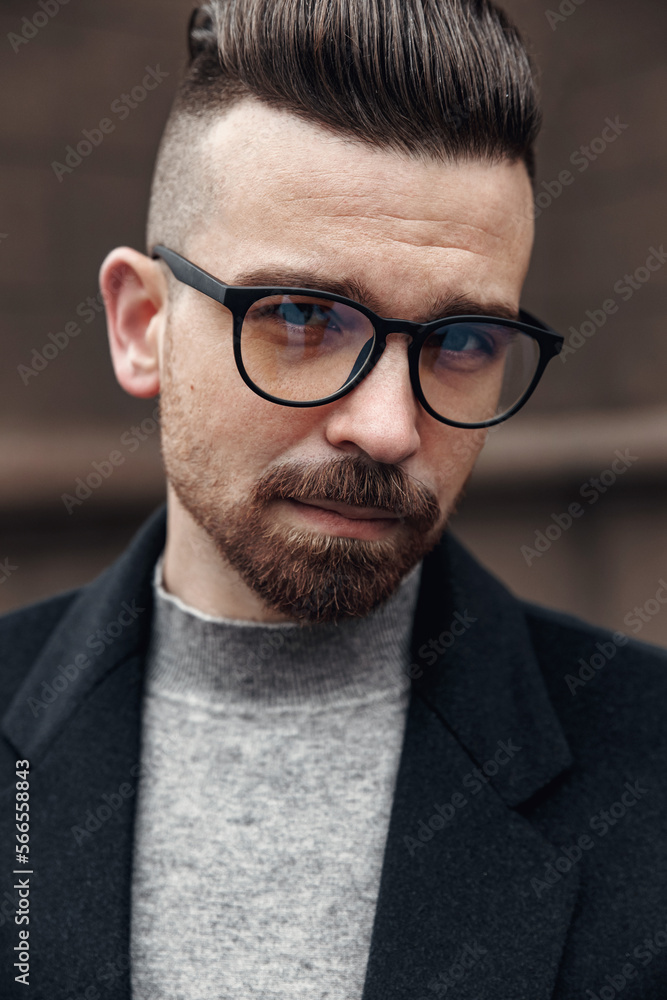 Close-up portrait thoughtful man in glasses looking at camera outdoor