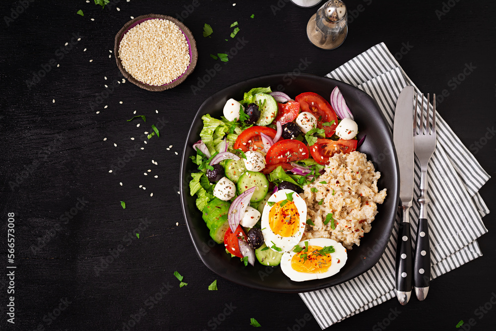 Healthy breakfast. Greek inspired savory oatmeal with fresh cucumber, tomatoes, olives, lettuce, mozzarella cheese and boiled egg. Top view