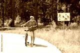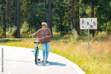 Senior older elderly modern woman rides a bicycle in a city park in the forest. Active pensioner, health lifestyle