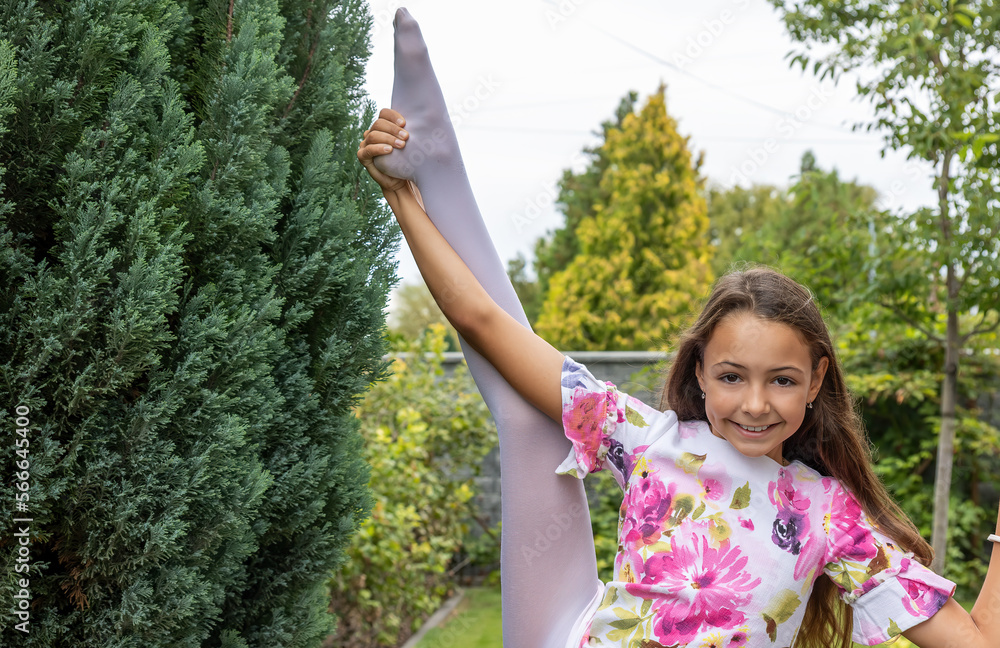 The girl raised her leg over her head smiling at the camera. Horizontally.