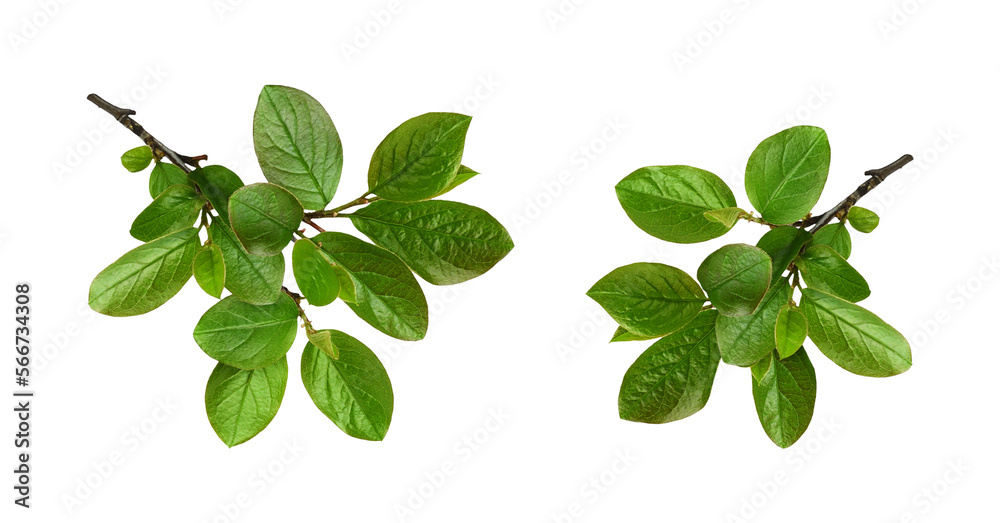 Set of twigs with spring green leaves isolated on whiteor transparent background