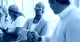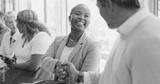 Handshake, hiring or people networking in waiting room before a recruitment job interview in an advertising agency. Partnership, relaxing or happy employees shaking hands, meeting or greeting in line