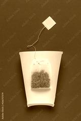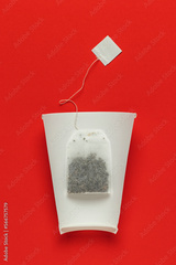 Disposable paper cup with tea bag on a red background. Flat lay. Top view.