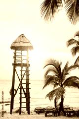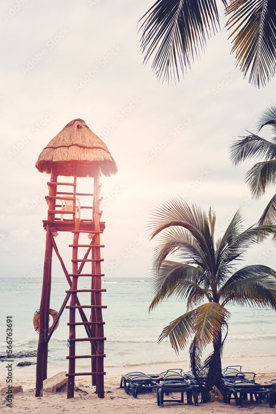 Retro toned picture of an empty tropical beach with lifeguard tower, travel concept.