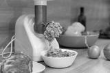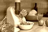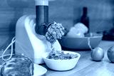 kitchen table with a meat grinder, homemade minced meat, home kitchen interior. Selective focus,