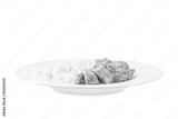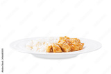 Orange teriyaki chicken with rice in a plate on a white isolated background