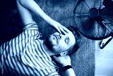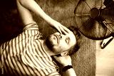 Heat wave during a summer, a man finds respite at his home balcony with the help of an electric fan. A man beats the summer heat wave by finding relief with an fan. The effect of global warming