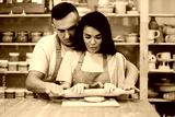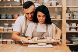 A young couple works in a pottery workshop. The concept of hobbies, lifestyle and relationships.