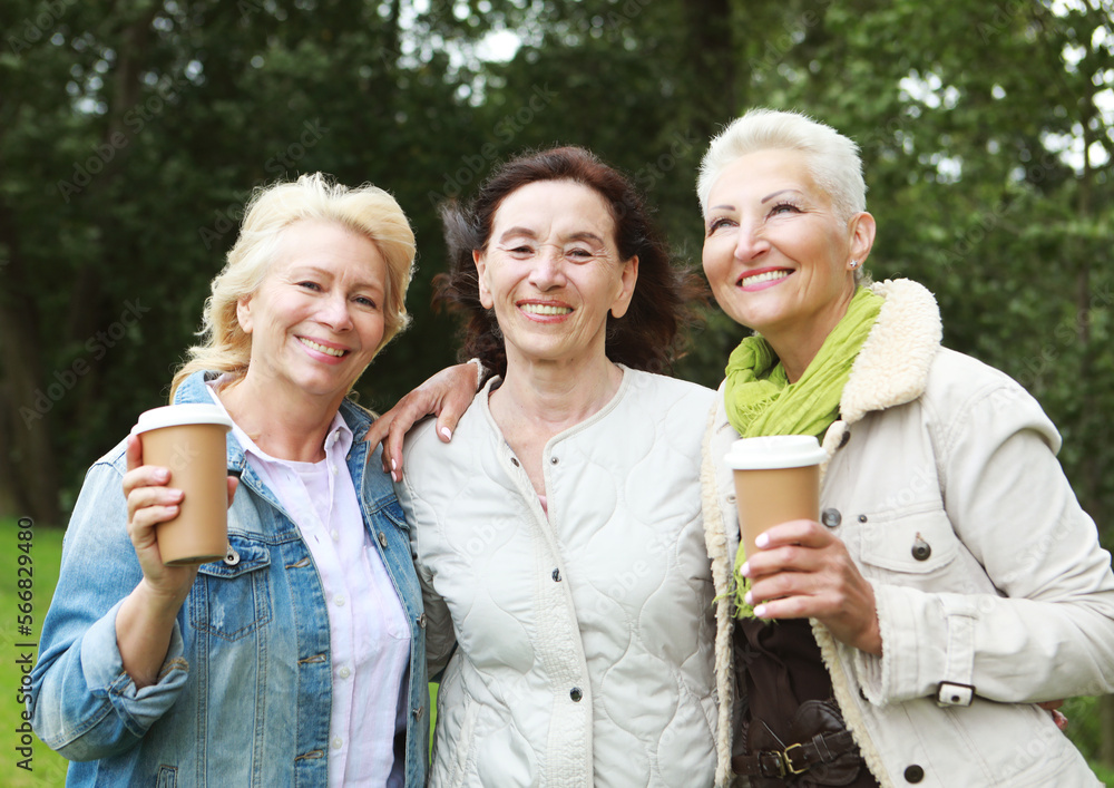 Charming elderly women friends are walking, talking and drinking coffee. Summer day in the park.