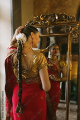 Female model Hindu Bride in saree, wearing gold and jasmine flower garlands in the hair near mirror