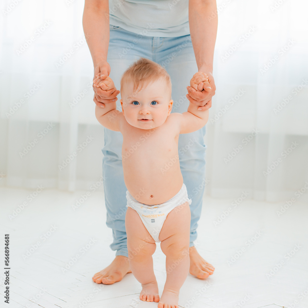 Cute little baby in a diaper learning to walk in a white room , mom holding his hands