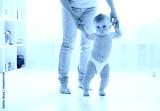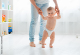 Cute little baby in a diaper learning to walk in a white room , mom holding his hands