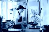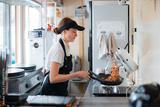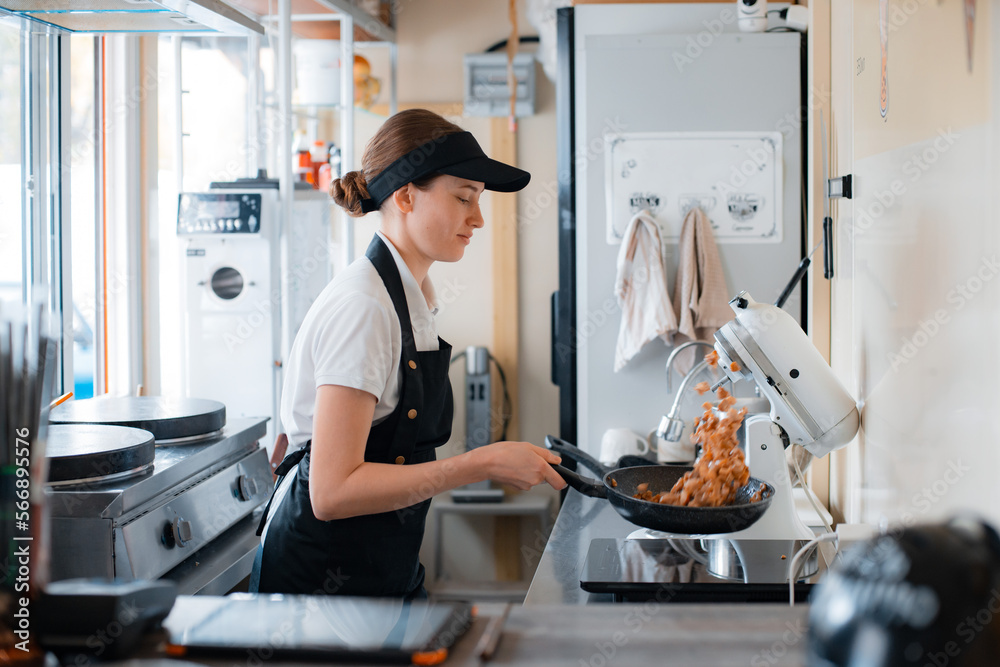 Portrait woman chef baking pancakes in an apron uniform. Fast food service of the city. fast food restaurant is a small business.