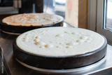 Portrait woman chef baking pancakes in an apron uniform. Fast food service of the city. fast food restaurant is a small business.