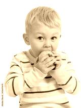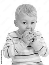 Kid boy eating green apple, isolated on white