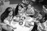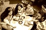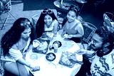 Group of cheerful indian friends having fun eating pizza talking and laughing together while drinking cocktails at restaurant cafe. Summer season, food and drinks. Top view. Fast food.