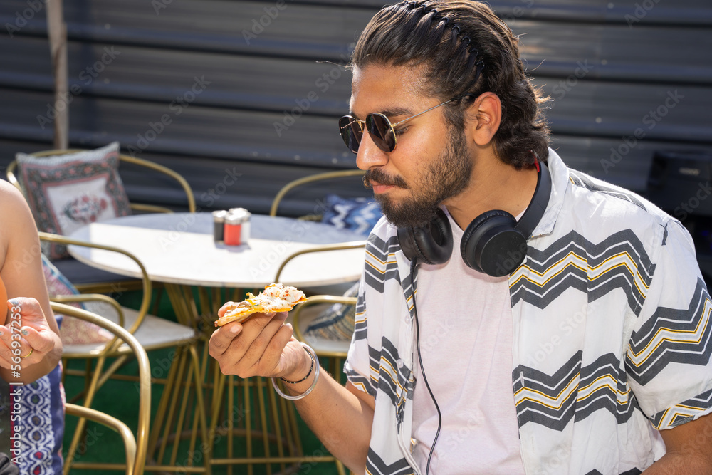 Happy Young indian man wearing sunglasses and headphone eating pizza at cafe restaurant outdoor. Summer season. Closeup.
