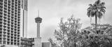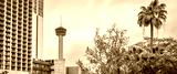 San Antonio Texas city skyline with warm glowing golden clouds, the Tower of Americas, and dried sycamore tree foliage and palm trees in winter