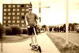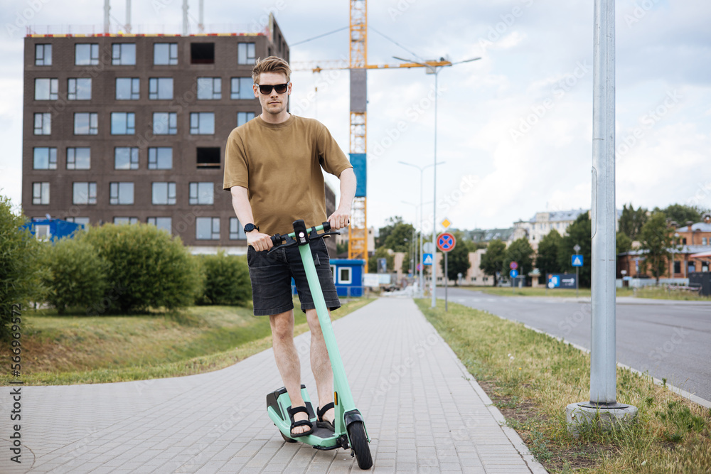 White man riding an electric scooter in the city showcases a trendy and efficient mode of transportation. Choice of sustainable transportation helps reduce the environmental impact of urban commuting