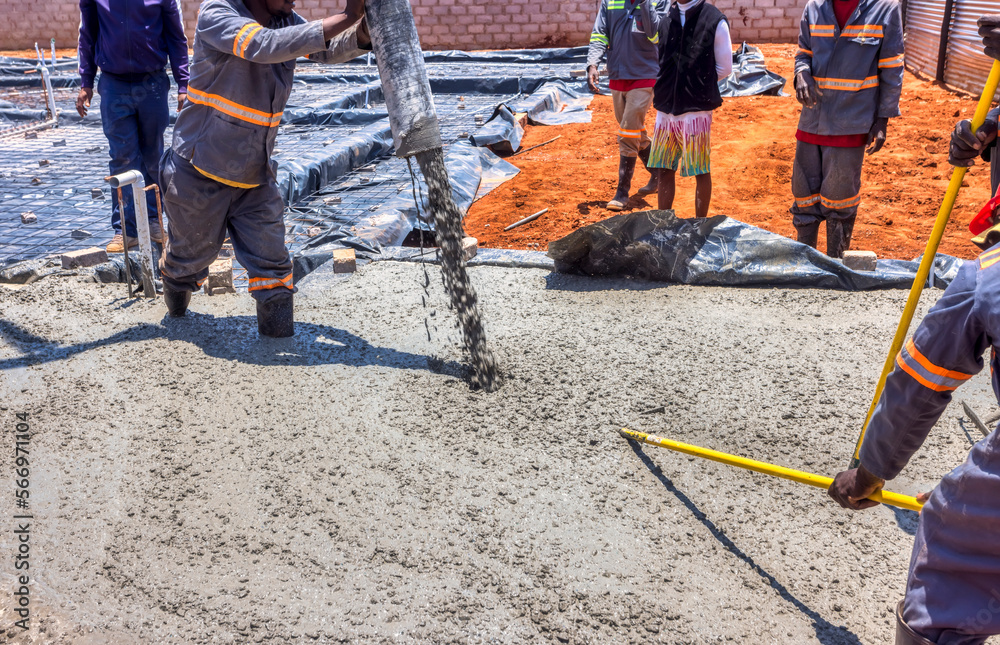 african construction workers using a boom concrete pump to fill the foundation of a building