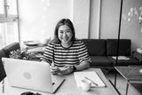Young woman sitting at desk working on laptop