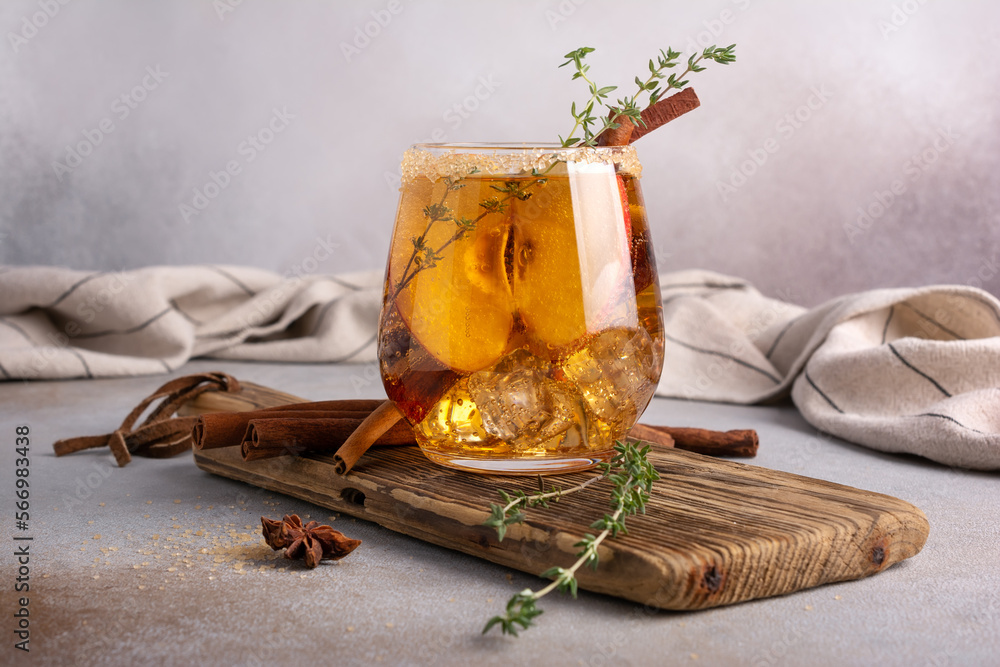 Ice cider or apple cocktail with spice and sugar in glass for refreshing in summer