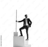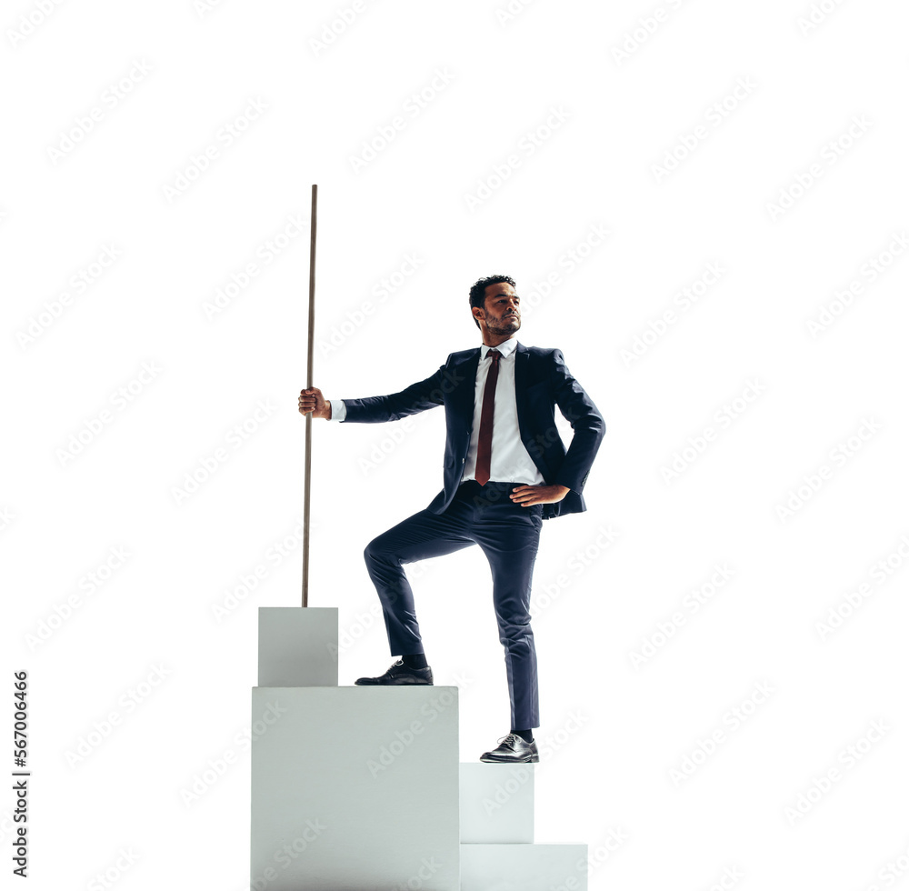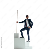 Successful business man standing on a block of stairs on a transparent background