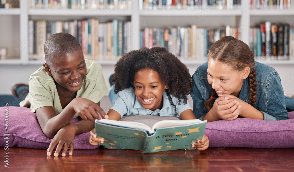 Children in library, book and reading with learning and education, happy with friends and academic growth. Knowledge, information and development with young students, learn with school group