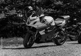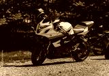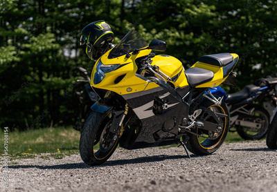 Yellow sportbike motorcycle with helmet on the parking in mountains
