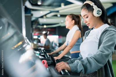 asian adult female sport woman jogger running on treadmill athletic working out active healthy lifestyle with cheerful freshness sweaty cardio exercise at fitness gym sport club morning wellness day