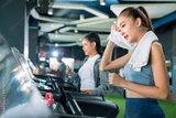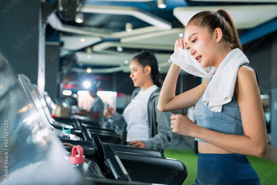 asian adult female sport woman jogger running on treadmill athletic working out active healthy lifestyle with cheerful freshness sweaty cardio exercise at fitness gym sport club morning wellness day