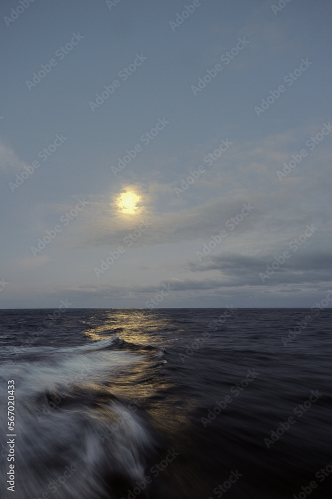 Full moon reflection on blurred stormy rocky Atlantic Ocean during night seen from luxury ocean liner cruiseship cruise ship during transatlantic passage voyage motion